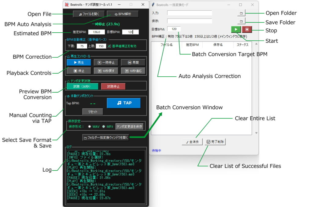 例)推定BPM=100、目標BPM=50 → 1/2倍速に(テンポだけ変化) - ✅ 高音質テンポチェンジ:音程は極力そのまま(SoX+ffmpeg連携)